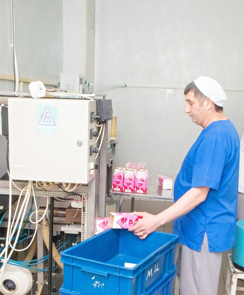 Для обеспечения жителей и предприятий города такой необходимой молочной продукцией, ежедневно трудятся работники молочного цеха и оборудование российского производства.